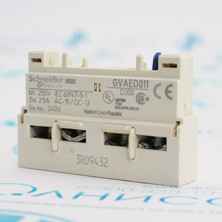 GVAED011 Контакт фронтальный Schneider Electric, количество нормально разомкнутых (НО) контактов: 1, количество нормально замкнутых (НЗ) контактов: 1, подходит для защитного выключателя двигателя, номинальный рабочий ток Ie при AC-15, 230 В: 0.5.