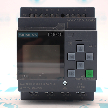 6ED1052-1HB08-0BA1 Модуль логический Siemens. LOGO! 24RCE, Модуль логический с дисплеем, питание/I/O: = /~24 В/ 24 В/реле, 8 DI/4 DQ, память - 400 блоков, расширяемый модулями, Ethernet, встроенный веб-сервер, журнал данных, пользовательские веб-страницы, стандартная карта MicroSD, настройка под LOGO! Soft Comfort V8.3 и выше, исполнение проектов из старых версий, облачное подключение для всех базовых модулей LOGO! 8,3.