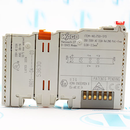 750-513 Модуль вывода Wago, передает управляющие сигналы от устройства автоматизации на подключенные исполнительные механизмы. Внутреннее напряжение системы запускает реле. Нормально разомкнутые контакты электрически изолированы. Состояние реле отображается светодиодом.