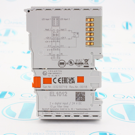 EL1012 Модуль Beckhoff, технология подключения: 4-проводной, количество входов: 2, номинальное напряжение: 24 В, электрическая изоляция: 500 В, входной ток: тип. 3 мА, входной фильтр: тип. 10 мкс.