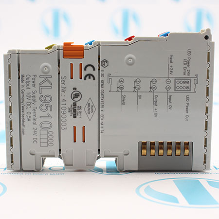 KL9510 Модуль ввода/вывода Beckhoff, генерирует выходное напряжение 10 В постоянного тока из входного напряжения (24 В постоянного тока), доступ к которому можно получить на терминале. Следующие модули ввода-вывода также получают это напряжение через силовые контакты. Светодиоды питания показывают рабочее состояние терминала.