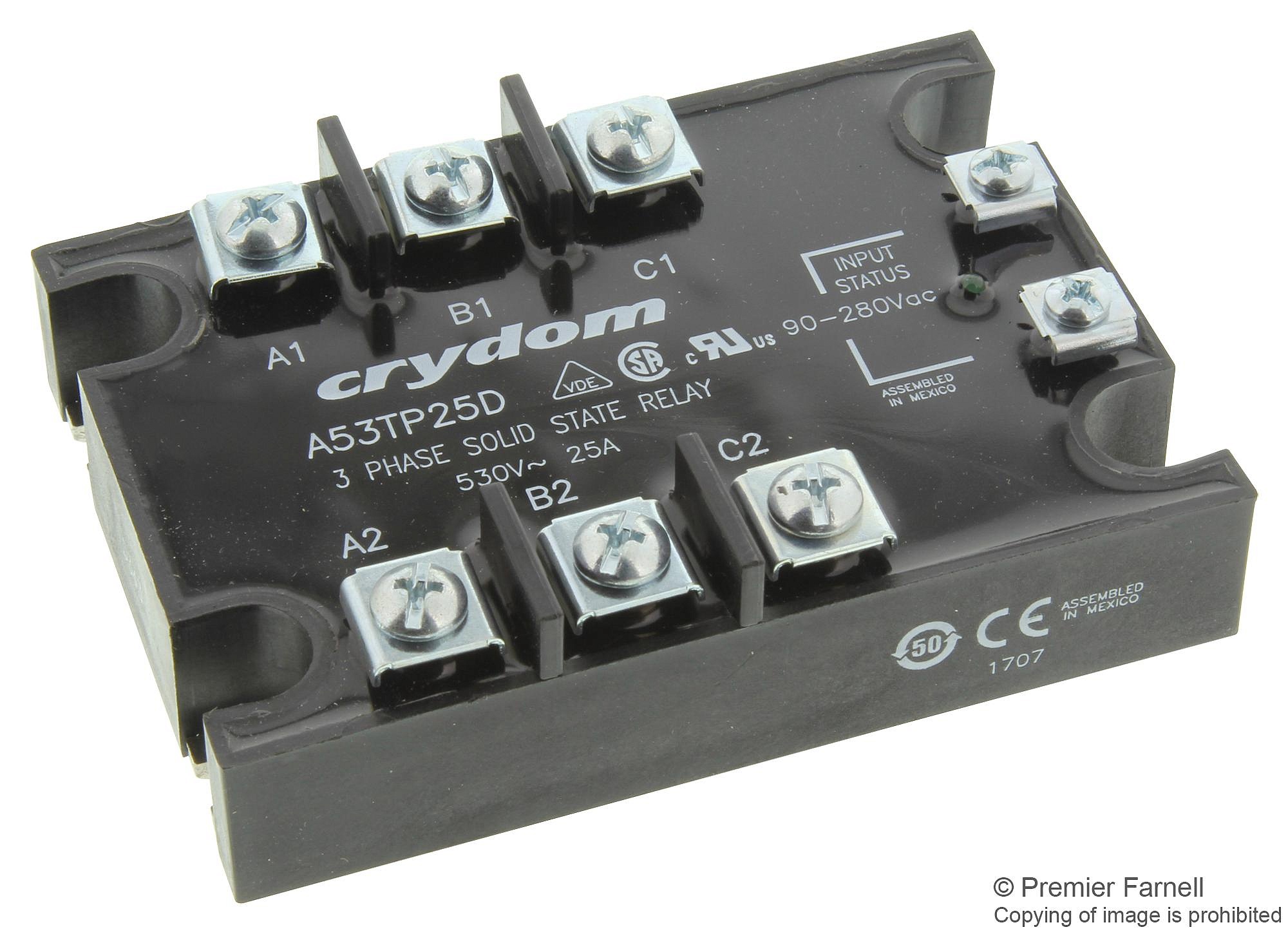 A53TP25D SSR Relay, 3-Phase, Panel Mount, IP00, 530VAC/25A, 90-280VAC In, Zero Cross Crydom