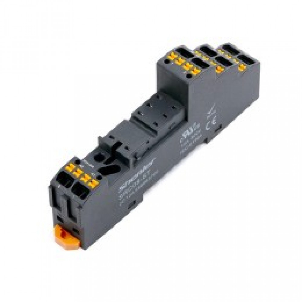 Колодка для реле, 1 группа переключающих контактов, push-in фиксация провода, монтаж на DIN рейку, 300V, 16A, для реле серий: R2G, с возможностью установки (поставляется отдельно): пластик. фикс. SR15L/20F/25C, марк. шильд. SR2P, модуль AMD