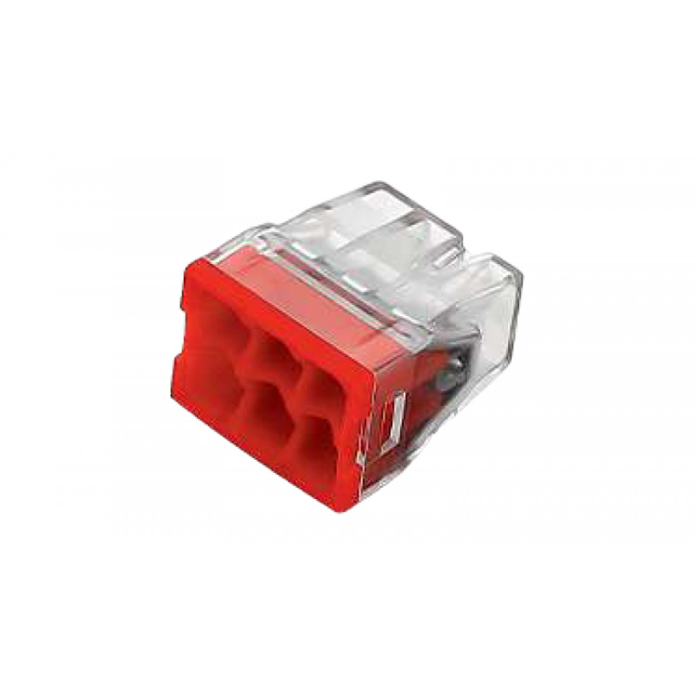 Клемма пружинна, универсальная, строительная, 6 полюсов, без контактной пасты, сечение проводника 0,5 - 2,5 мм кв., 400V, 24A, цвет: прозрачный/красный