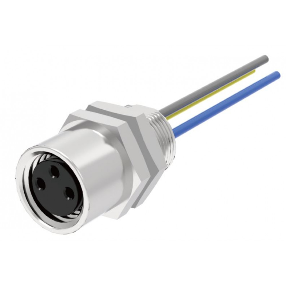 Розеточный разъем в панель, 4 полюса, M8, гайка сзади, с проводом 0,5 метра, A-Code, 3А, 60V, резьба на гайке M8*0.5, резьбовое соединение: латунь неэкранированный