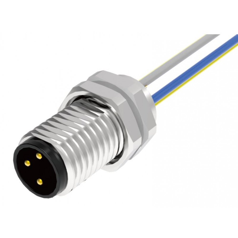 Вилочный разъем в панель, 4 полюса, M8, гайка спереди, с проводом 0,5 метра, A-Code, 3А, 60V, резьба на гайке M8*1.0, резьбовое соединение: латунь неэкранированный