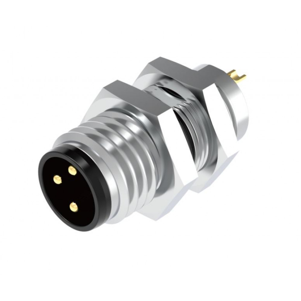 Вилочный разъем в панель, 6 полюсов, M8, гайка сзади, вывод под пайку, A-Code, 1,5А, 30V, резьба на гайке M8*0.5, резьбовое соединение: латунь, неэкранированный