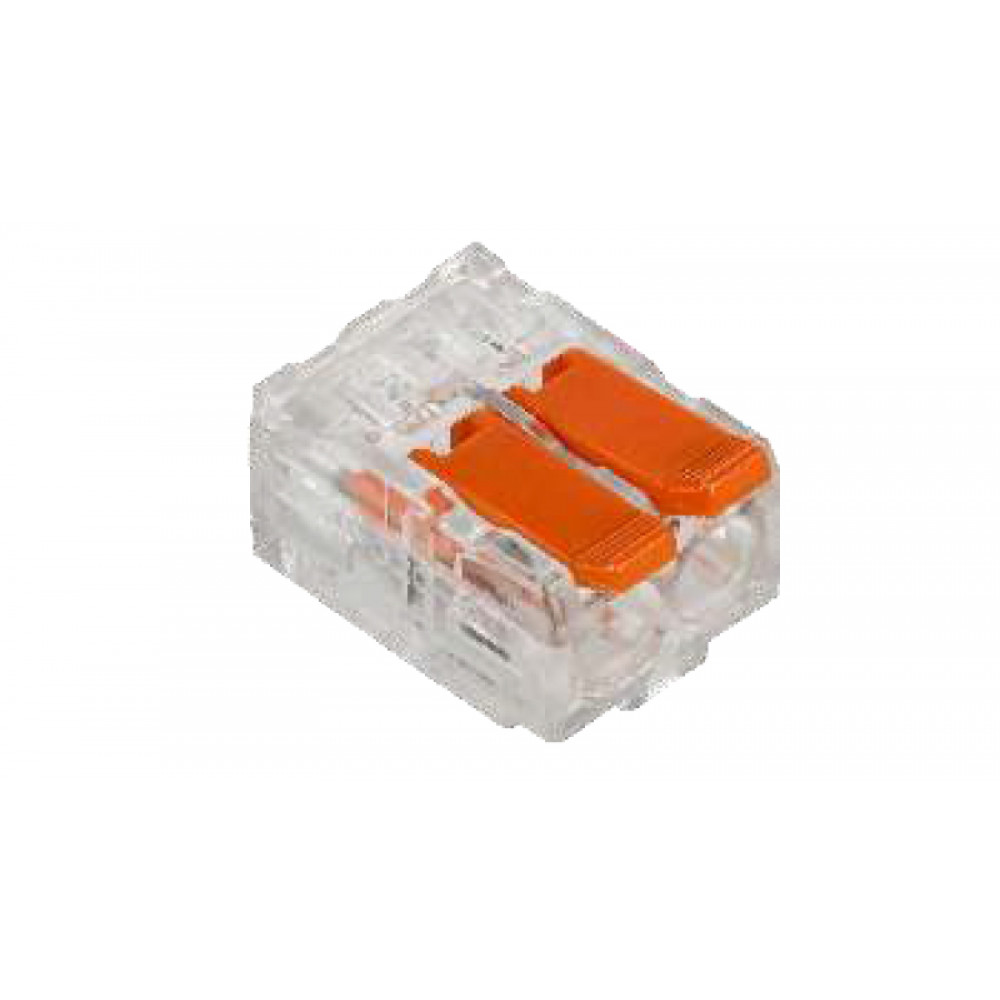 Рычажная клемма, соединительная, универсальная, 2 полюса, сечение проводника 0,5 - 6,0 мм кв., 450V,41A, цвет корпуса: прозрачный, цвет рычагов: оранжевый (Аналог 221-612)