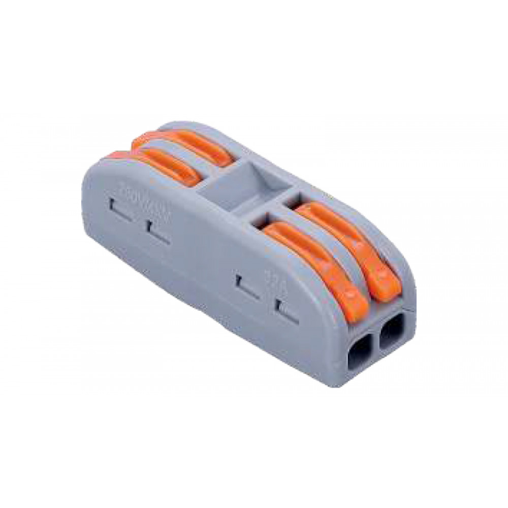 Рычажная клемма, проходная, универсальная, 2 полюса, сечение проводника 0,08 - 4,0 мм кв., 250V, 32A,цвет корпуса: серый, цвет рычагов: оранжевый,в упаковке 50 штук (Аналог 222-4122)