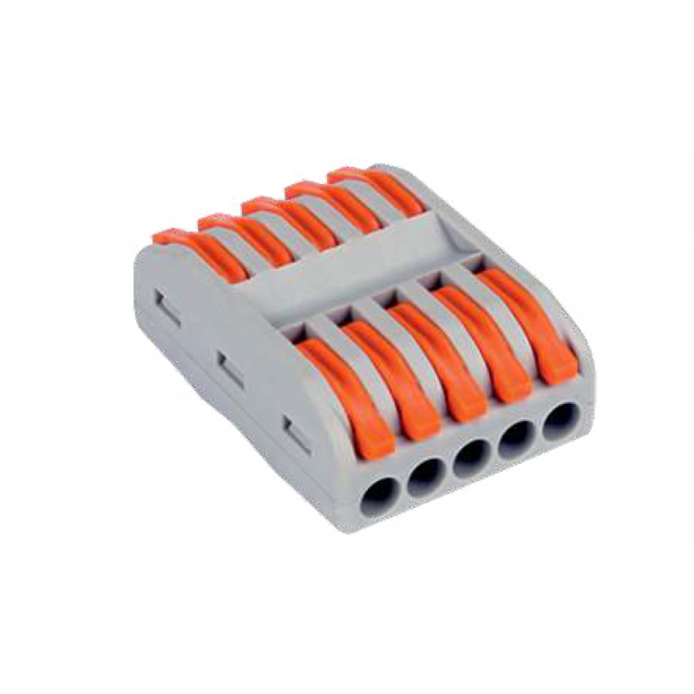 Рычажная клемма, проходная, универсальная, 5 полюсов, сечение проводника 0,08 - 4,0 мм кв., 250V, 32A,цвет корпуса: серый цвет рычагов: оранжевый,в упаковке 30 штук (Аналог 222-4155)