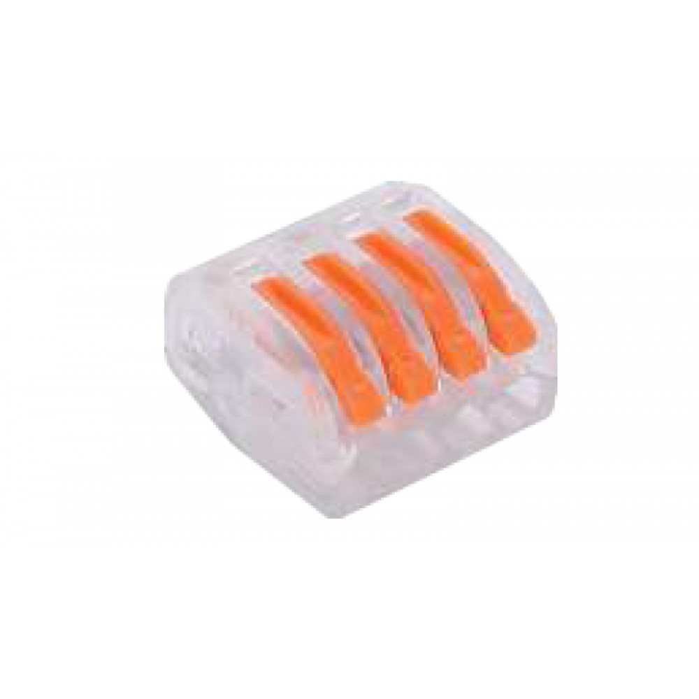 Рычажная клемма, соединительная, универсальная, 4 полюса, сечение проводника 0,08 - 4,0 мм кв., 250V, 32A,цвет корпуса: прозрачный, цвет рычагов: оранжевый,в упаковке 50 штук (Аналог 222-414)