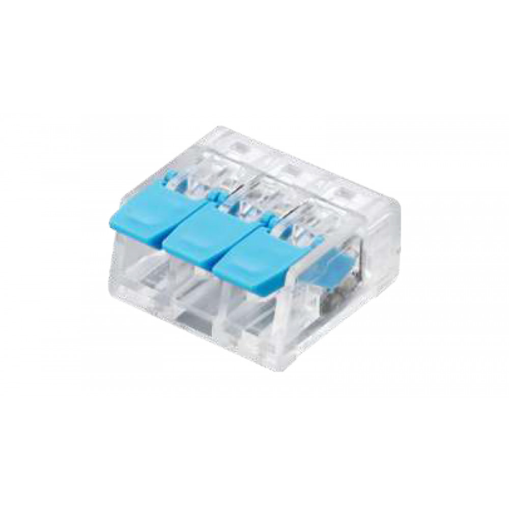 Рычажная клемма, соединительная, универсальная, 3 полюса, сечение проводника 0,08 - 4,0 мм кв., 250V, 32A,цвет корпуса: прозрачный, цвет рычагов: синий,в упаковке 50 штук (Аналог 221-413)