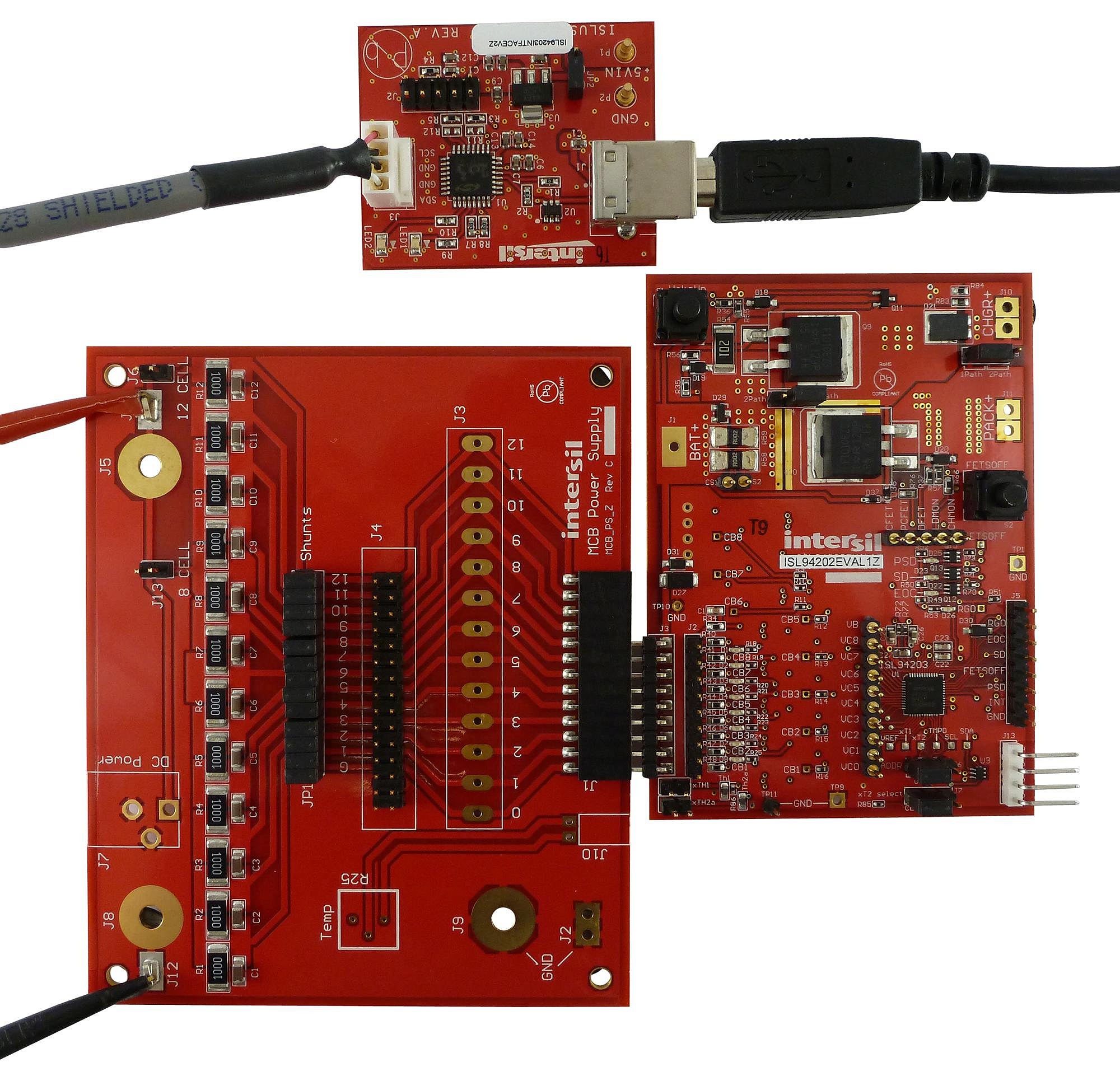 Содержимое комплектаEval Kit ISL94202, тестовая плата многоячеечного источника питания MCB-PS-Z, комплект интерфейса USB-I2C, USB-кабель