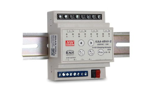 Универсальный актуатор KNX с функцией защиты данных, 4 канала, вх. напр. 21…31В, ток 10А на канал, димминг 0-10 В, -30…+45°C, в корпусе 72×90×57мм на ДИН рейку
