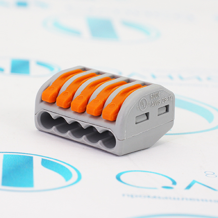 222-415 Клемма соединительная Wago, номинальное напряжение, В: 400, номинальный ток, А: 20, количество зажимов, клемм: 5, максимальное сечение зажимаемого провода,AWG: 28/11, номинальное сечение проводника, мм²: 0.08/2.5(4), вес, г: 1.3.