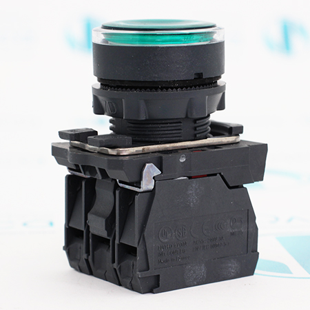 XB5AW33B5 Кнопка с подсветкой Schneider Electric, пластик, скрытый, зеленый, Ø22, пружинный возврат, 24 V AC/DC, 1 НО + 1 НЗ, температура окружающей среды: -40…70 °C.