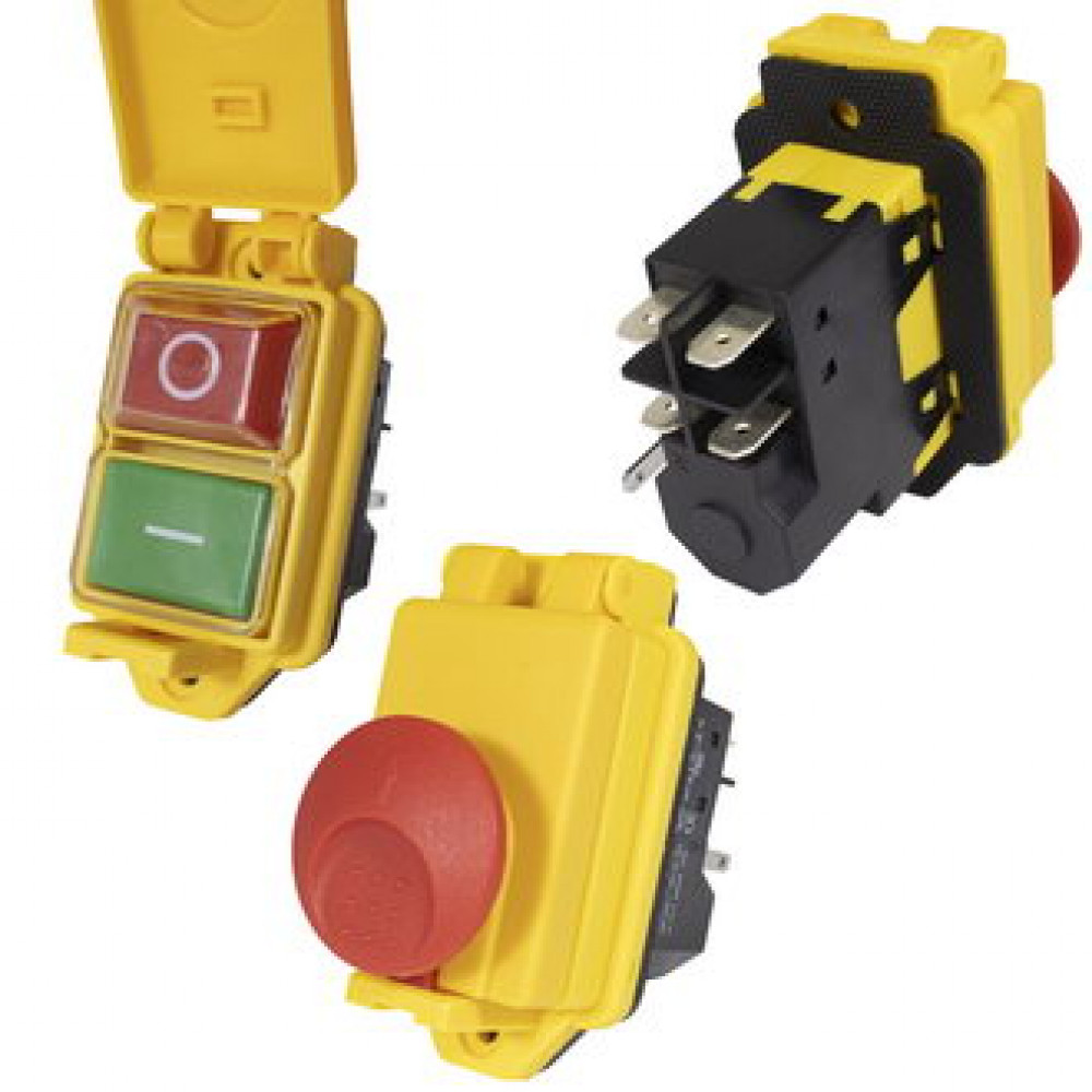 Кнопочный переключатель RUICHI AELA-22-R, 57х53х32 мм, 5 контактов под ножевую клемму, 15 А, IP55, 250 В, корпус пластиковый, корпус черный/желтый, кнопка красная/зеленая