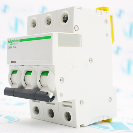 A9F74304 Выключатель автоматический Schneider Electric, 3-полюсный, 4А, 6кА (хар-ка C).  Аппараты iC60N отвечают требованиям как бытового (ГОСТ Р 50345), так и промышленного (ГОСТ 50030.2) стандартов. Сочетают в функции защиты цепей от токов короткого замыкания и перегрузки. Обеспечивают возможность секционирования в промышленных электроустановках. Сигнализируют об аварийном отключении посредством индикатора состояния - функция Visi Trip. Обеспечивают видимый разрыв, благодаря зеленой полосе над тумблером включения - функция Visi Safe.
