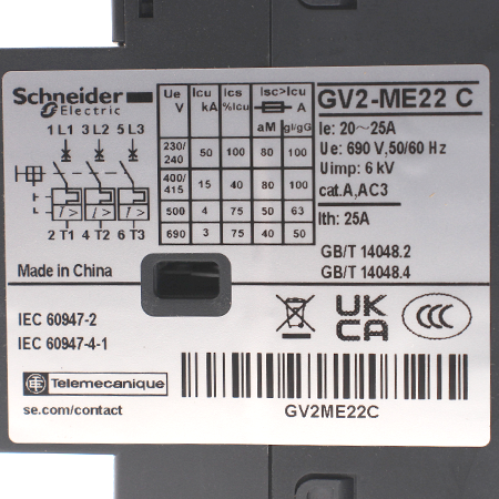 GV2ME22 (GV2ME22C) Выключатель автоматический Schneider Electric TeSys GV, предназначен для защиты электродвигателей 11kW 400V. Обеспечивает защиту от перегрузки по току и от коротких замыканий, диапазон уставок теплового расцепителя (от перегрузки) 20-25A, электромагнитный расцепитель с фиксированной уставкой 12xIn, высокая отключающая способность Icu 15kA 400V. Кнопка включения и отключения гарантировано рассчитана на 100 000 циклов в условиях AC-3 415V. Доступность по всему миру, сертифицирован по множеству стандартов (IEC, UL, CSA, CCC, EAC, Marine) и подходит под условия Green Premium (RoHs/Reach).