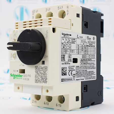 GV2P10 Выключатель автоматический Schneider Electric,  TeSys GV2 6.3А 3P, термомагнитный расцепитель. Это трехполюсный автоматический выключатель с комбинированным расцепителем для защиты электрических двигателей от коротких замыканий и перегрузок. Предназначен для установки на DIN-рейку или монтажную панель с винтовыми зажимами, управление осуществляется поворотной рукояткой. Размеры: 8.9x4.5x9.7 см, работает в электросетях до 690В.