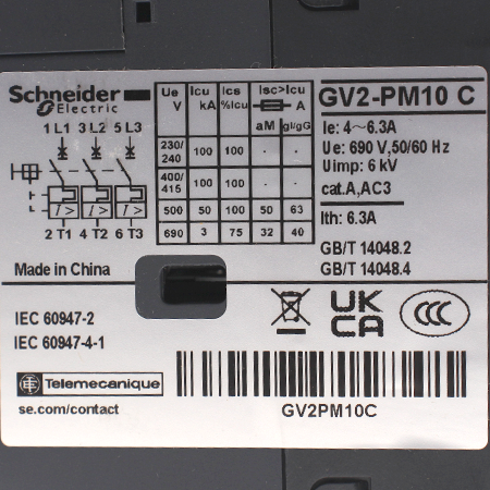 GV2PM10 (GV2PM10C) Выключатель автоматический Schneider Electric TeSys GV, предназначен для защиты электродвигателей 2.2kW 400V. Обеспечивает защиту от перегрузки по току и от коротких замыканий, диапазон уставок теплового расцепителя (от перегрузки) 4 — 6.3A, электромагнитный расцепитель с фиксированной уставкой 12xIn, высокая отключающая способность Icu 100kA 400V. Поворотная рукоятка гарантировано рассчитана на 100 000 циклов в условиях AC — 3 415V. Доступность по всему миру, сертифицирован по множеству стандартов (IEC, UL, CSA, CCC, EAC, Marine) и подходит под условия Green Premium (RoHs/Reach).