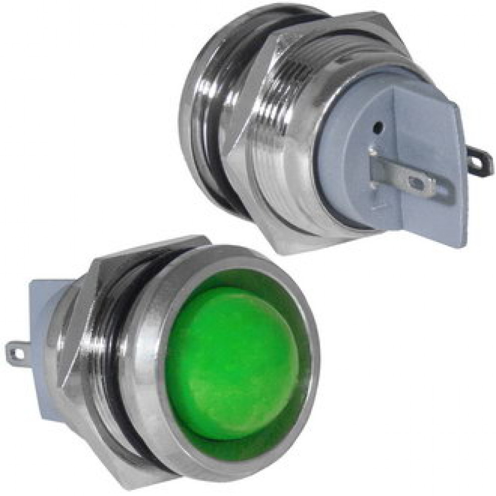 Индикатор антивандальный RUICHI GQ19PR-G, цвет зеленый, точечный излучатель, 12-24 В, 15 мА, гибкие выводы, никелированная латунь