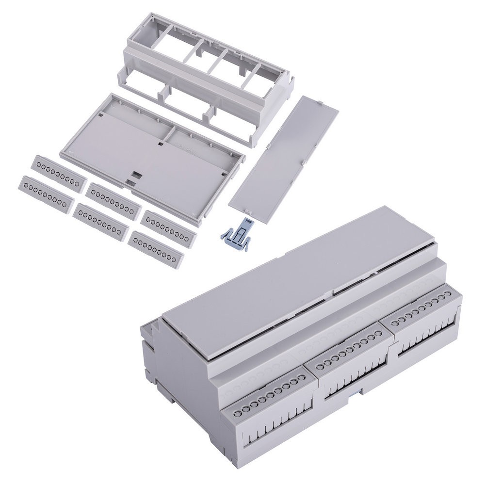 Модульные корпуса серии DxMG предназначены для установки на DIN-рейку EN60715. Имеют быстросборную конструкцию. Материал: поликарбонат/ABS UL94-VO. Верхняя крышка может быть прозрачной в видимом или ИК диапазоне. В комплект поставки входят: основание, корпус, крышка, защитные заглушки и клипса для крепления на рейку.