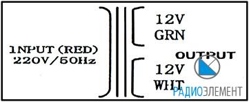 Цвет маркировка выводов - красный - 220 В; зеленый - 12 В; белый - 12 В