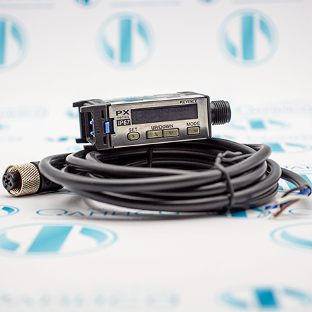 PX-10CP Датчик Keyence. Отличительная особенность датчика PX-10CP - это двойной 7-сегментный дисплей. Два красных светодиода и оранжевый светодиод DSC индицируют работу. Заданное значение (4-значный зеленый светодиод) и текущее значение (4-значный красный светодиод) горят вместе, диапазон текущих значений: от 0 до 65504, избыточное усиление: от 0 P до 999 P. Возможно отображение как пиковых, так и нижних значений задержки. Выбирается из 5 вариантов. Отображается избыточное усиление (от 85% до 115% за 7 шагов). Присутствует функция масштабирования дисплея.