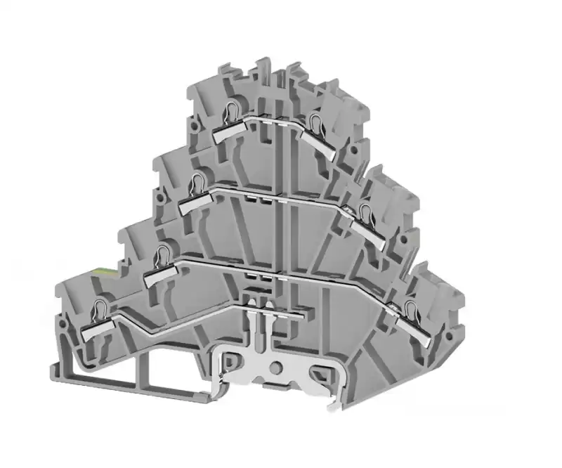 Клеммник пружинный быстрозажимной (Push in) — это высококачественное и надёжное решение для соединения проводов. Он представляет собой трёхъярусное устройство с контактами, предназначенное для установки на DIN-рейку.