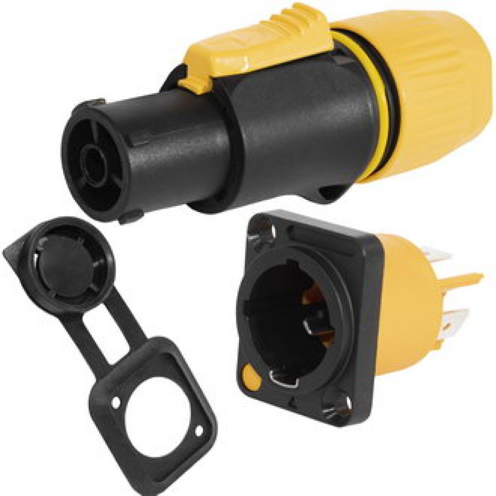 Разъем питания с фиксатором RUICHI NAC3FX-W-R, 3 контакта, 16 А, 250 В, 3 мОм, на панель, крепление корпуса винтовое, корпус PA66, черный/желтый