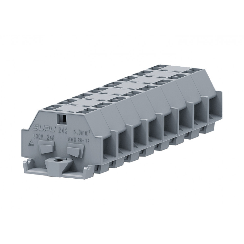 Мини клемма, боковой подвод кабеля, 4 точки подключения в клемме, тип фиксации провода: пружинный, номинальное сечение: 4 мм кв., 24A, 630V, цвет: серый, тип монтажа: монтажные фланцы
