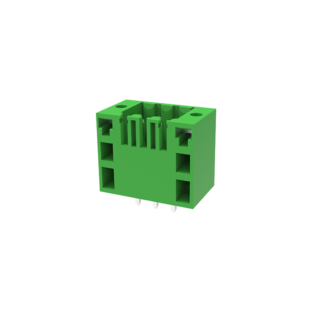 Вилочный разъем, вертикальный, два контакта на полюс, на плату, шаг: 3.5 мм, 16 полюсов, фиксация на плате пайкой, исполнение: с монтажными фланцами, 125A, 10A, цвет: зеленый