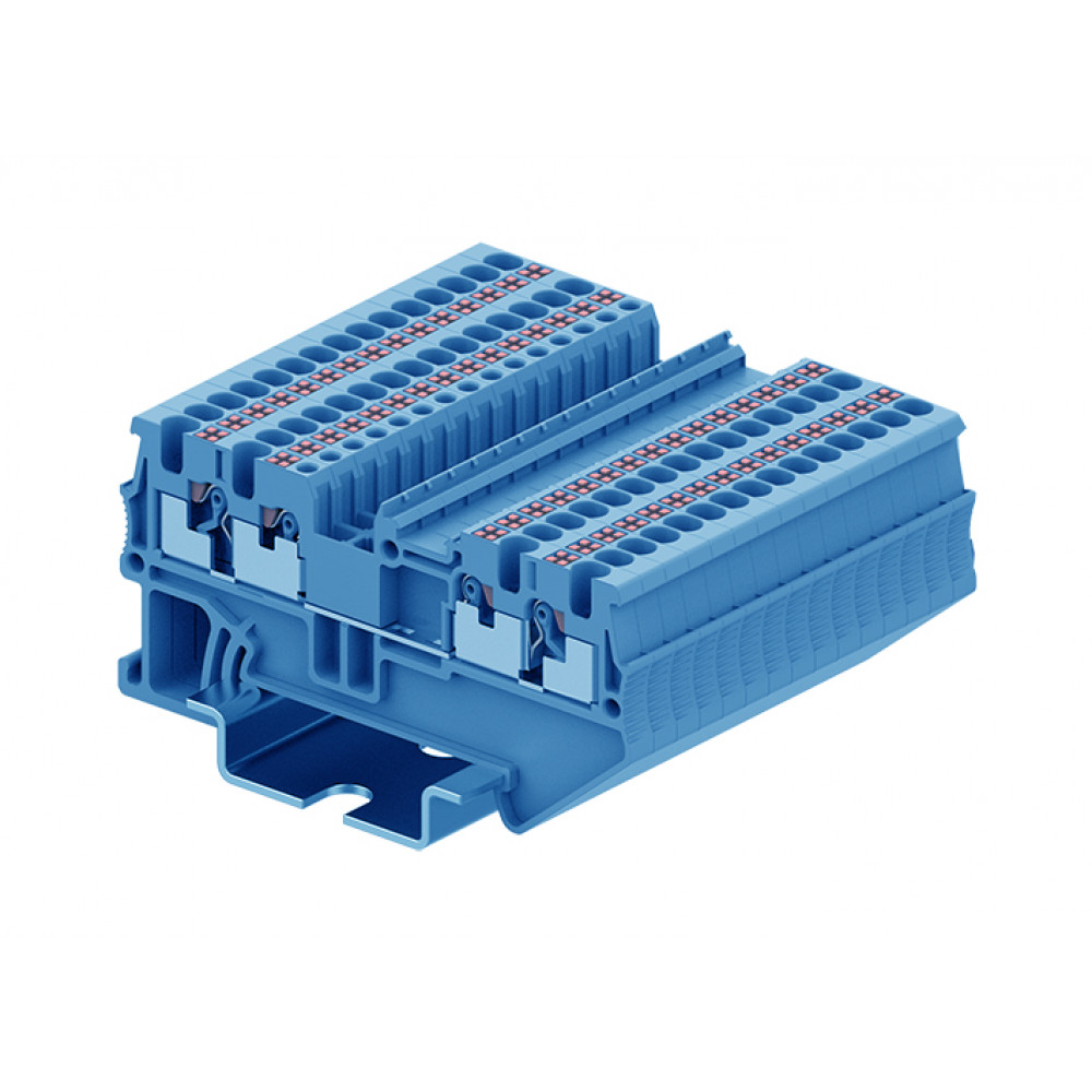 Проходная клемма, 4 точки подключения, тип фиксации провода: Push-in, номинальное сечение: 1.5 мм кв., 17,5A, 500V, ширина: 3,5 мм, цвет: синий, тип монтажа: DIN35