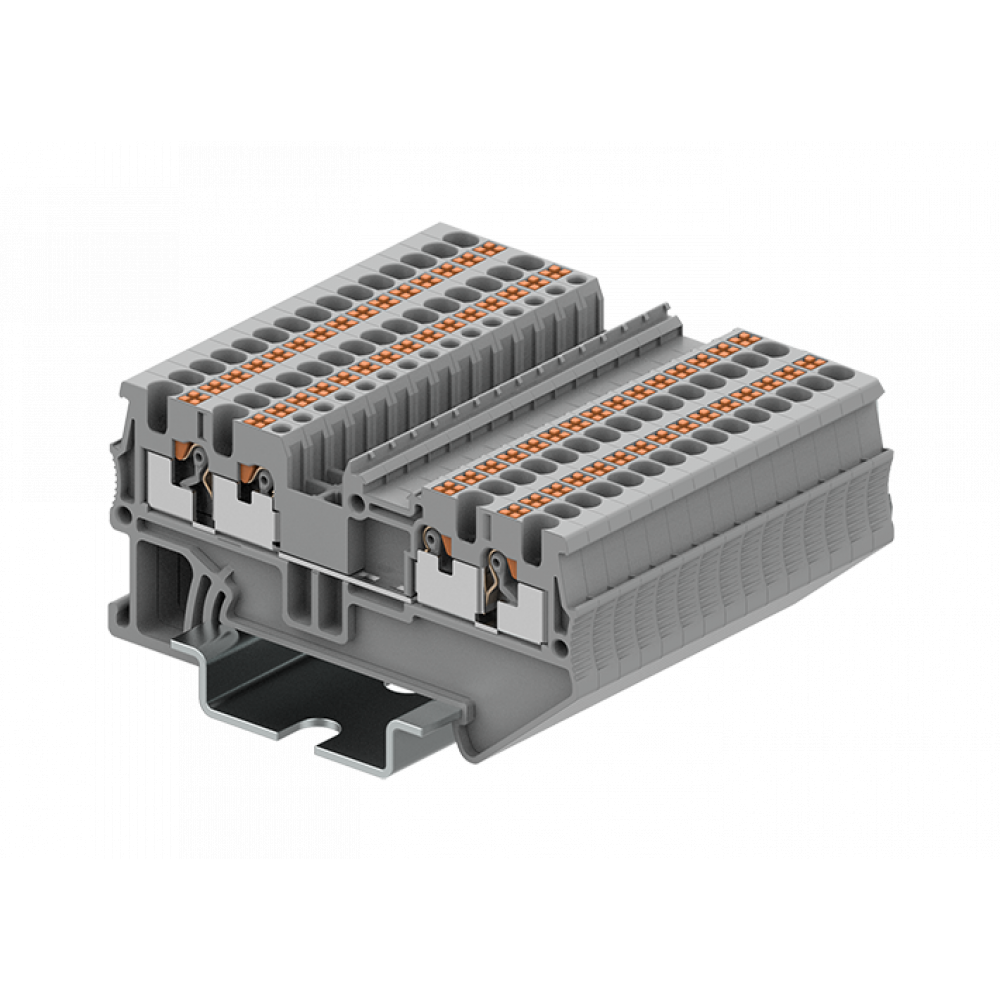 Проходная клемма, 4 точки подключения, тип фиксации провода: Push-in, номинальное сечение: 1.5 мм кв., 17,5A, 500V, ширина: 3,5 мм, цвет: серый, тип монтажа: DIN35