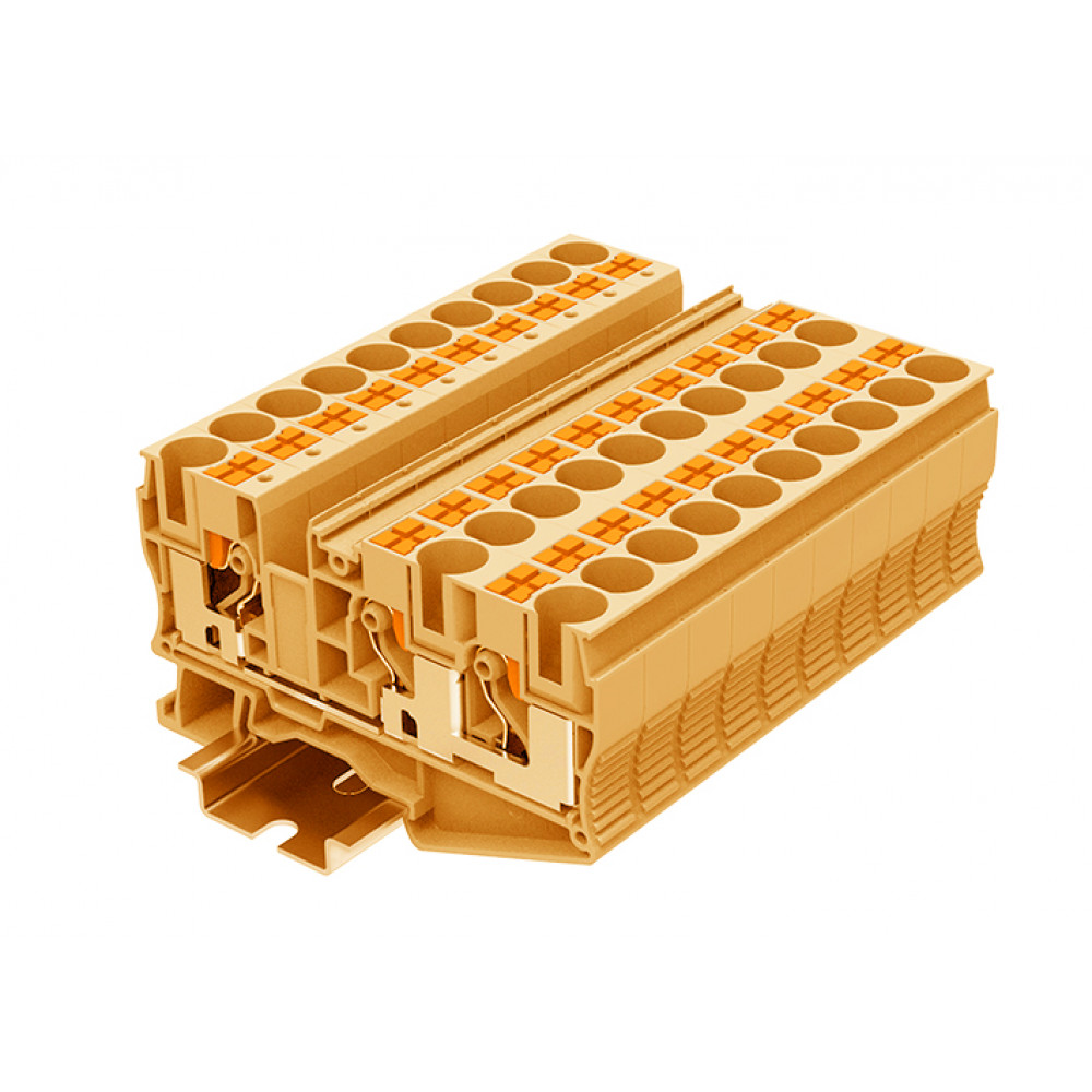 Проходная клемма, 3 точки подключения, тип фиксации провода: push-in, номинальное сечение: 10 мм кв., 57A, 1000V, ширина: 10,2 мм, цвет: оранжевый, тип монтажа: DIN 35