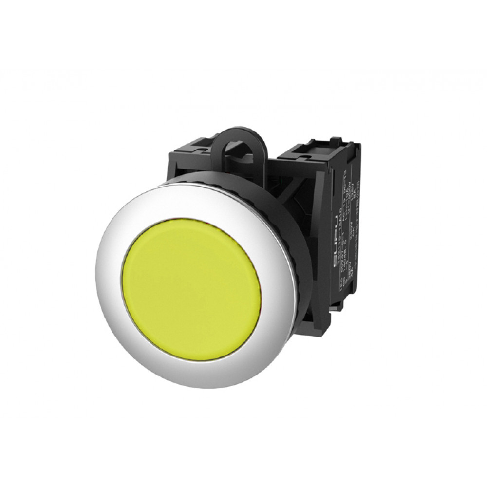 Кнопка круглая плоская, с блокировкой, без подсветки, утопленное алюминиевое переднее кольцо, без контактной группы, диаметр головки кнопки 36 мм, диаметр посадочного отверстия: 22 мм, цвет: желтый