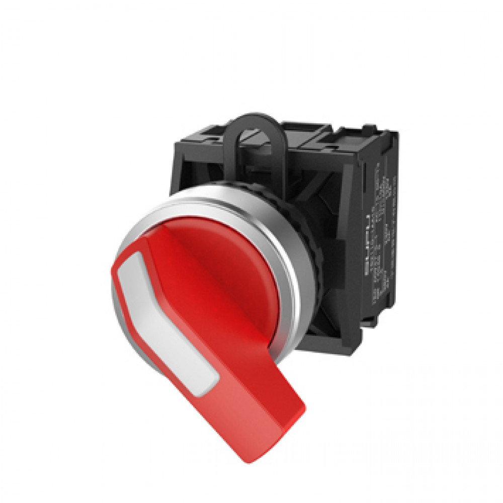 Переключатель, длинная ручка, 2-х позиционный без самовозврата, без подсветки, алюминиевое переднее кольцо, без контактной группы, диаметр головки кнопки 29,5 мм, диаметр посадочного отверстия: 22 мм, цвет: красный