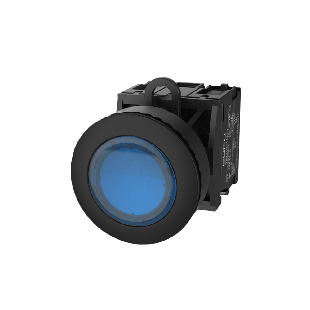 Кнопка круглая плоская, без блокировки, с подсветкой, утопленное пластиковое переднее кольцо, без контактной группы, диаметр головки кнопки 36 мм, диаметр посадочного отверстия: 22 мм, цвет: синий