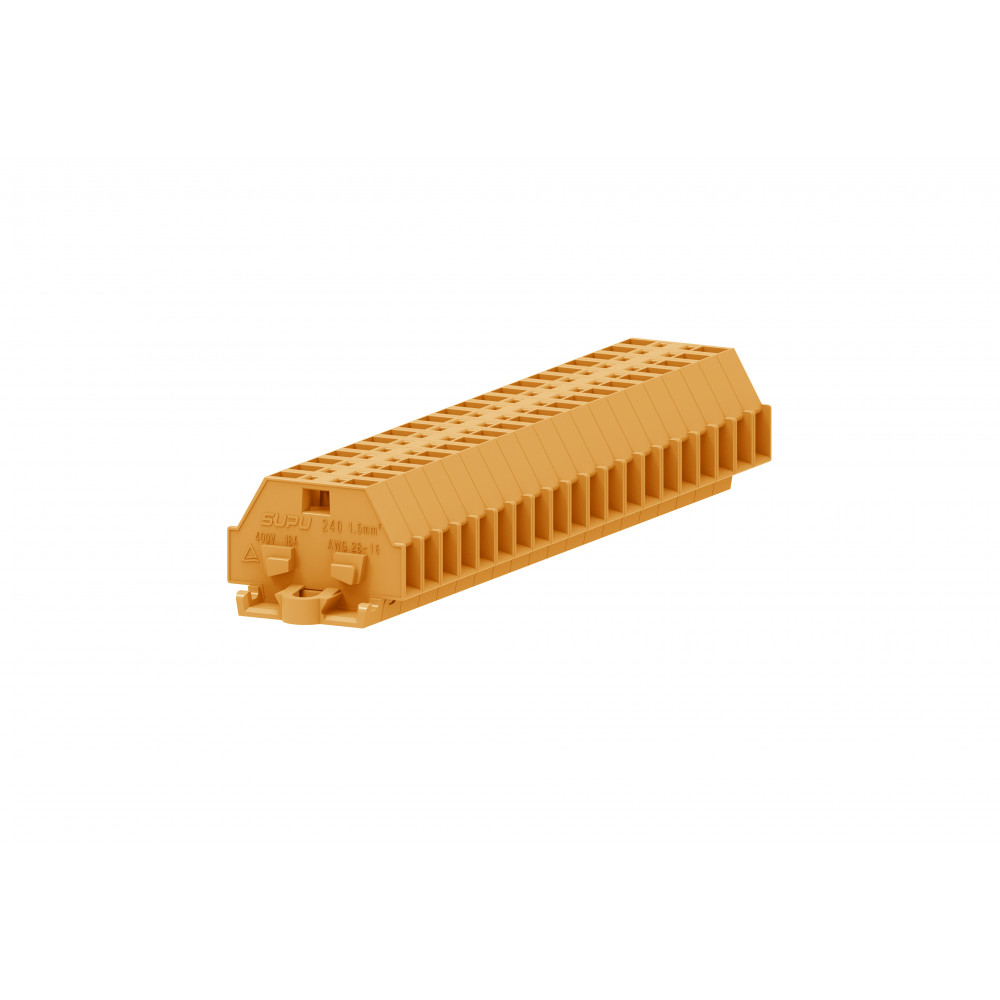 Мини клемма, боковой подвод кабеля, 2 точки подключения в клемме, тип фиксации провода: пружинный, номинальное сечение: 1,5 мм кв., 18A, 400V, цвет: оранжевый, тип монтажа: монтажные фланцы