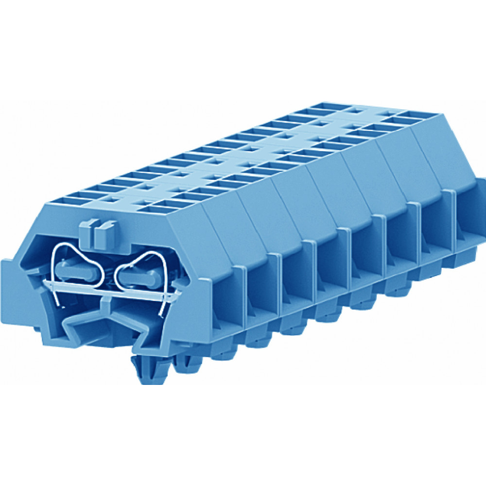 Мини клемма, боковой подвод кабеля, 4 точки подключения в клемме, тип фиксации провода: пружинный, номинальное сечение: 1,5 мм кв., 18A, 400V, цвет: синий, тип монтажа: защелки в панель
