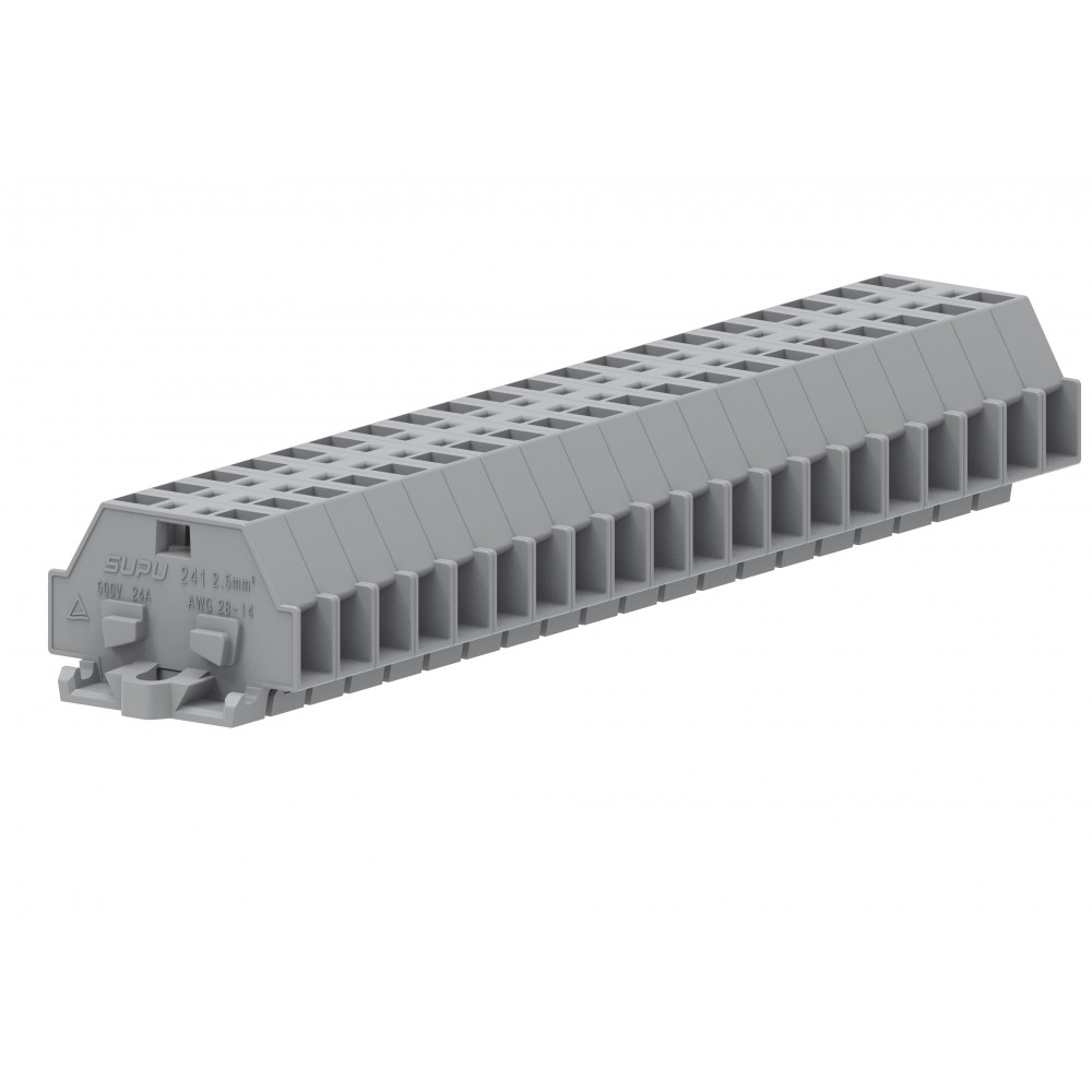 Мини клемма, боковой подвод кабеля, 2 точки подключения в клемме, тип фиксации провода: пружинный, номинальное сечение: 2,5 мм кв., 24A, 500V, цвет: серый, тип монтажа: монтажные фланцы