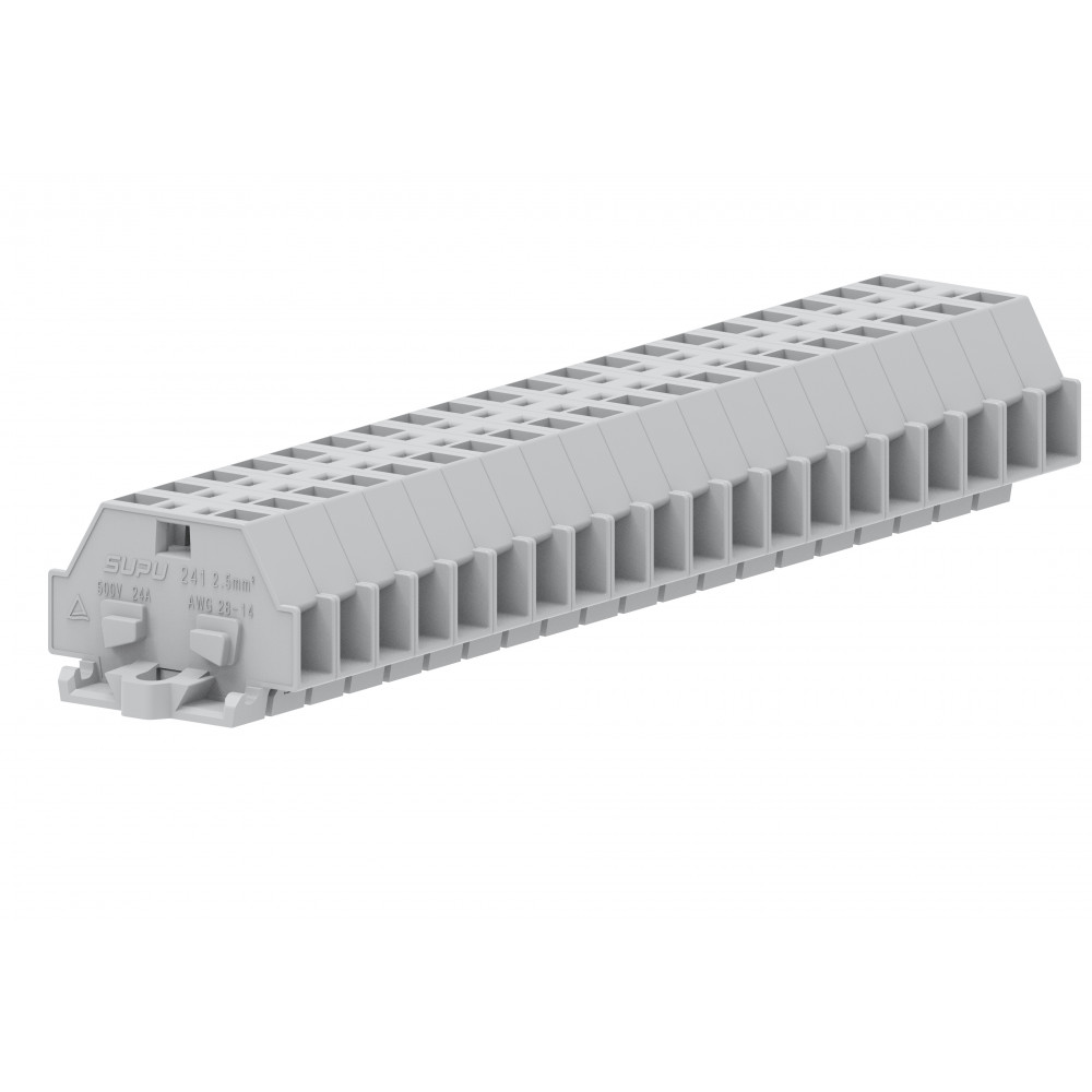 Мини клемма, боковой подвод кабеля, 2 точки подключения в клемме, тип фиксации провода: пружинный, номинальное сечение: 2,5 мм кв., 24A, 500V, цвет: светло-серый, тип монтажа: монтажные фланцы