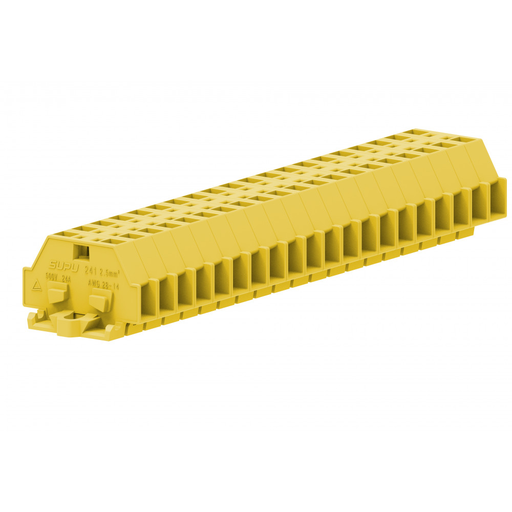 Мини клемма, боковой подвод кабеля, 2 точки подключения в клемме, тип фиксации провода: пружинный, номинальное сечение: 2,5 мм кв., 24A, 500V, цвет: желтый, тип монтажа: монтажные фланцы