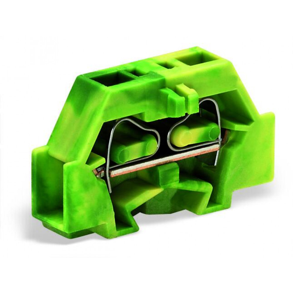 Мини клемма, боковой подвод кабеля, 2 точки подключения в клемме, тип фиксации провода: пружинный, номинальное сечение: 2,5 мм кв., 24A, 500V, цвет: желто-зеленый, тип монтажа: монтажные фланцы
