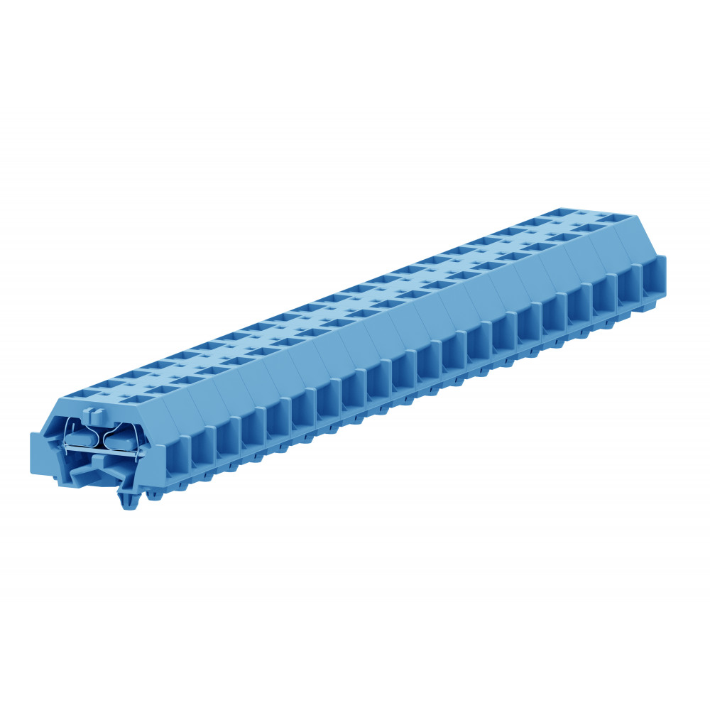 Мини клемма, боковой подвод кабеля, 4 точки подключения в клемме, тип фиксации провода: пружинный, номинальное сечение: 2,5 мм кв., 24A, 500V, цвет: синий, тип монтажа: защелки в панель