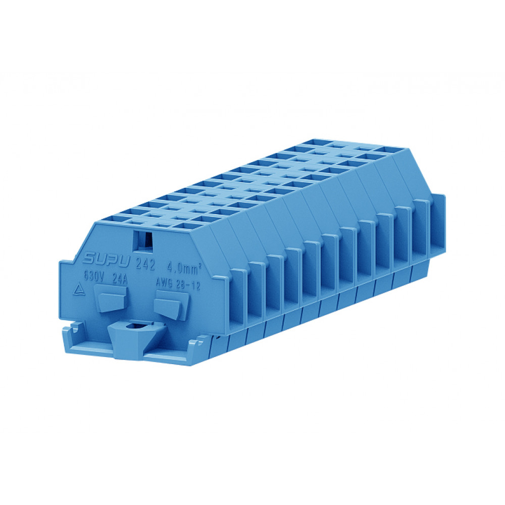 Мини клемма, боковой подвод кабеля, 2 точки подключения в клемме, тип фиксации провода: пружинный, номинальное сечение: 4 мм кв., 24A, 630V, цвет: синий, тип монтажа: монтажные фланцы