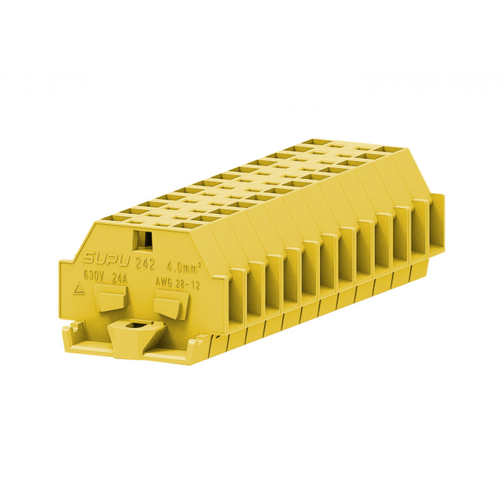 Мини клемма, боковой подвод кабеля, 2 точки подключения в клемме, тип фиксации провода: пружинный, номинальное сечение: 4 мм кв., 24A, 630V, цвет: желтый, тип монтажа: монтажные фланцы