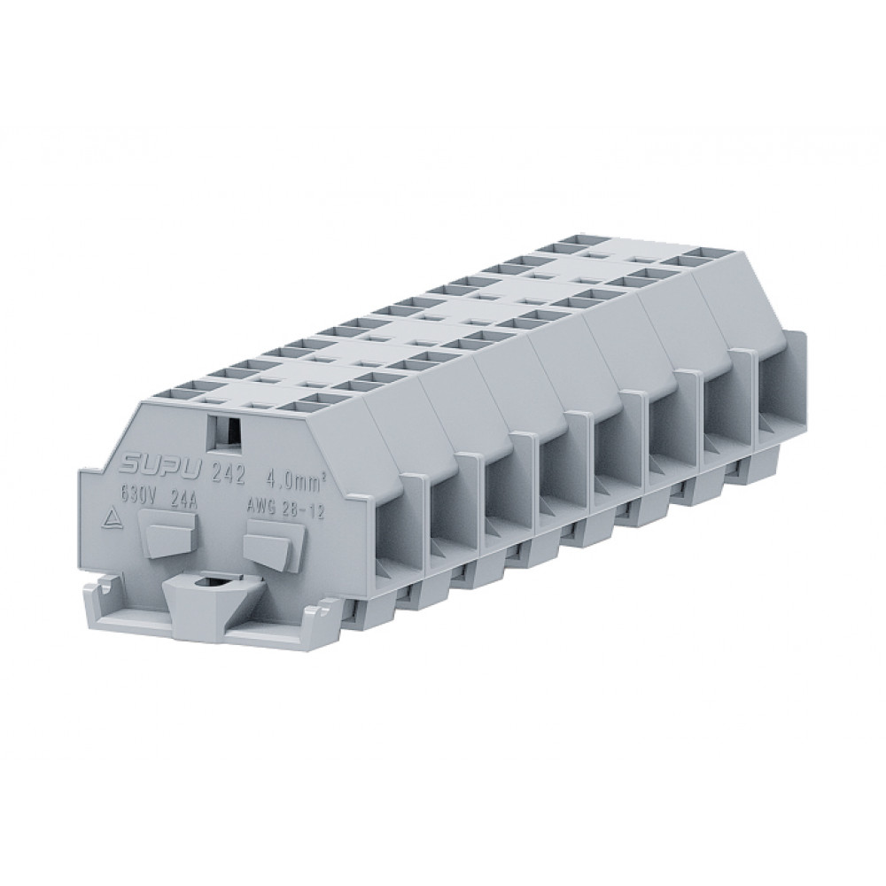 Мини клемма, боковой подвод кабеля, 4 точки подключения в клемме, тип фиксации провода: пружинный, номинальное сечение: 4 мм кв., 24A, 630V, цвет: светло-серый, тип монтажа: монтажные фланцы