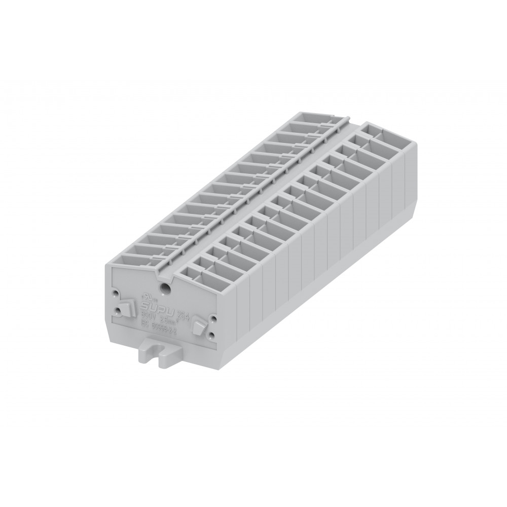 Мини клемма, верхний подвод кабеля, 2 точки подключения в клемме, тип фиксации провода: пружинный, номинальное сечение: 2,5 мм кв., 24A, 800V, цвет: светло-серый, тип монтажа: монтажные фланцы
